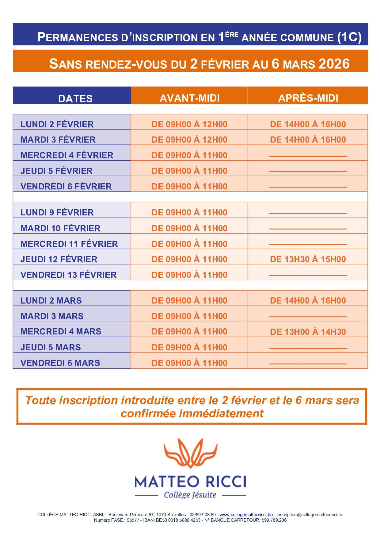 - LES INSCRIPTIONS EN 1ÈRE ANNÉE COMMUNE SE DÉROULERONT DU 2 FEVRIER AU 6 MARS SELON L’HORAIRE CI-DESSOUS.
